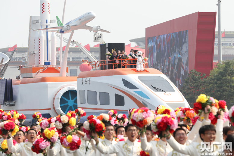 代表科技創(chuàng)新領域的“創(chuàng)新驅動”方陣彩車駛過長安街(央廣網(wǎng)記者 韓靖 攝)