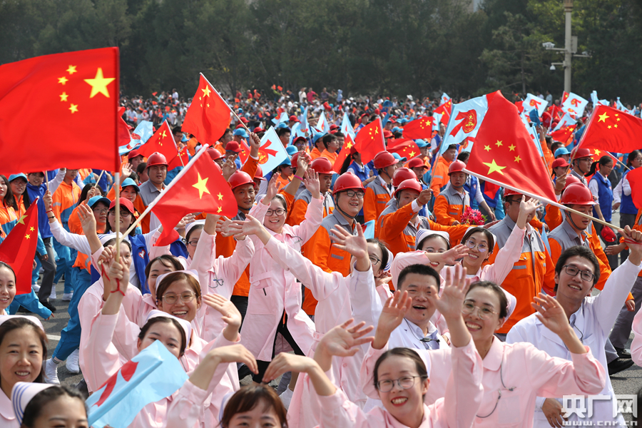 在群眾游行隊伍中有工人、教師、警察、醫(yī)生、企業(yè)家等職業(yè),他們來自祖國各地不同崗位,用各自的方式為祖國建設添磚加瓦,用實際行動講述“我和我的祖國”的故事。