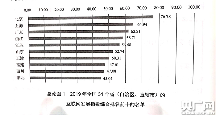 據(jù)《報告》,2019年全國31個。ㄗ灾螀^(qū)、直轄市)的互聯(lián)網(wǎng)發(fā)展指數(shù)綜合排名前十的名單為:北京、上海、廣東、浙江、江蘇、山東、天津、福建、四川、湖北。經(jīng)濟發(fā)達地區(qū)的互聯(lián)網(wǎng)發(fā)展水平最高,中西部地區(qū)也在加大發(fā)展力度,發(fā)展勢頭強勁。