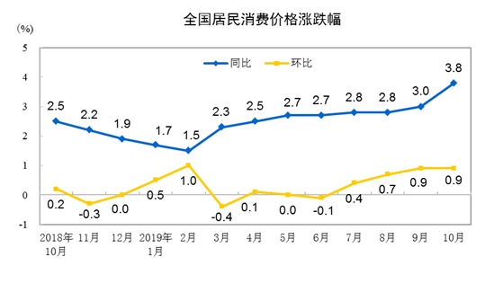 從同比看,CPI上漲3.8%,漲幅比上月擴(kuò)大0.8個百分點(diǎn)。其中,食品價格上漲15.5%,漲幅擴(kuò)大4.3個百分點(diǎn),影響CPI上漲約3.05個百分點(diǎn);非食品價格上漲0.9%,漲幅回落0.1個百分點(diǎn),影響CPI上漲約0.70個百分點(diǎn)。