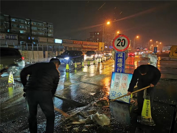 北京四惠樞紐站在高架橋撒融雪劑保障車輛行駛安全(北京公交 供圖)