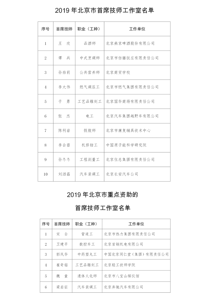 北京市人社局公布“2019年北京市首席技師工作室名單”和“2019年北京市重點(diǎn)資助的首席技師工作室名單工作室名單”(央廣網(wǎng)發(fā) 北京市人社局制圖)