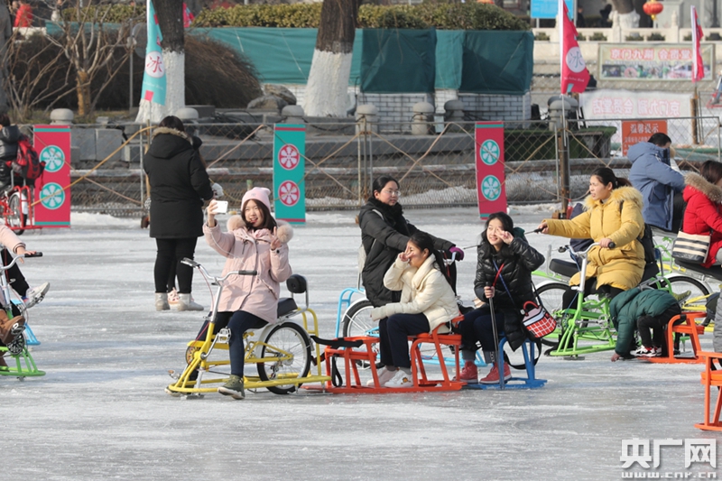 游客正在體驗(yàn)冰上自行車項(xiàng)目(央廣網(wǎng)記者 韓靖 攝)