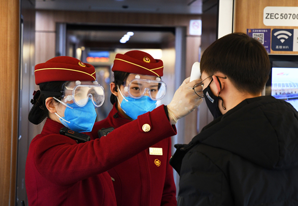 1月31日,京津城際列車乘務(wù)員在對乘客進(jìn)行體溫檢測(北京鐵路供圖 楊寶森 攝)
