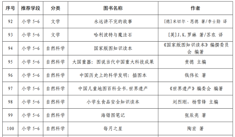 《指導(dǎo)目錄》小學(xué)段部分推薦書(shū)目(央廣網(wǎng)發(fā) 來(lái)源:教育部)