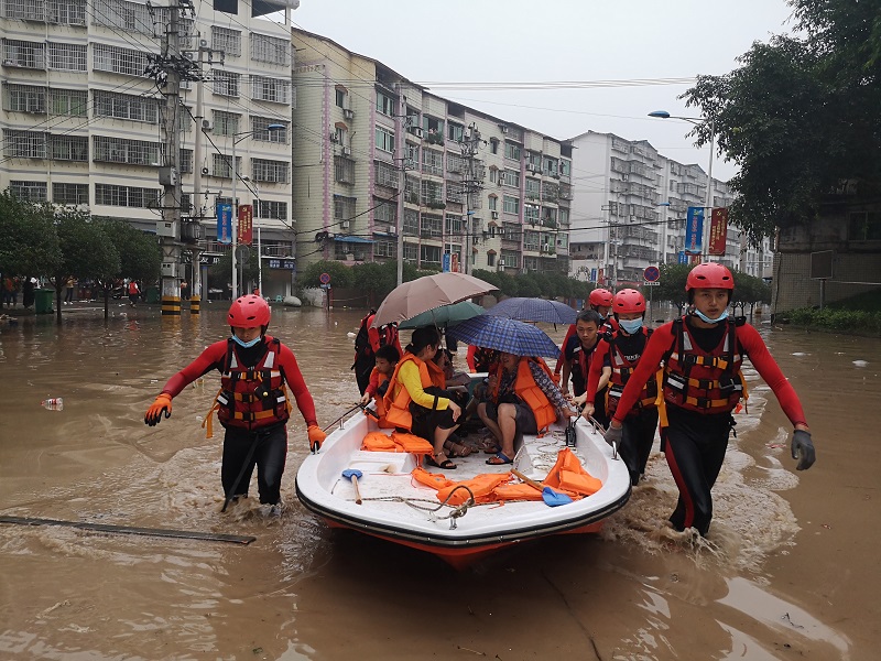 6月22日,重慶市江津區(qū)西湖鎮(zhèn)綦河流域洪峰過境,部分群眾被困,消防員迅速調(diào)集沖鋒舟等裝備前往救援(央廣網(wǎng)發(fā) 應急管理部消防救援局供圖)