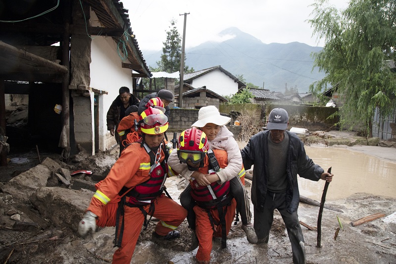 6月27日6時50分,涼山州消防救援支隊搜救人員在冕寧縣大煲子村一處被山洪沖毀的危房中營救出三名被困群眾(央廣網(wǎng)發(fā) 應急管理部消防救援局供圖)