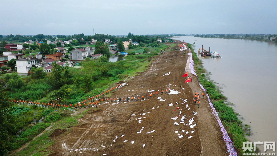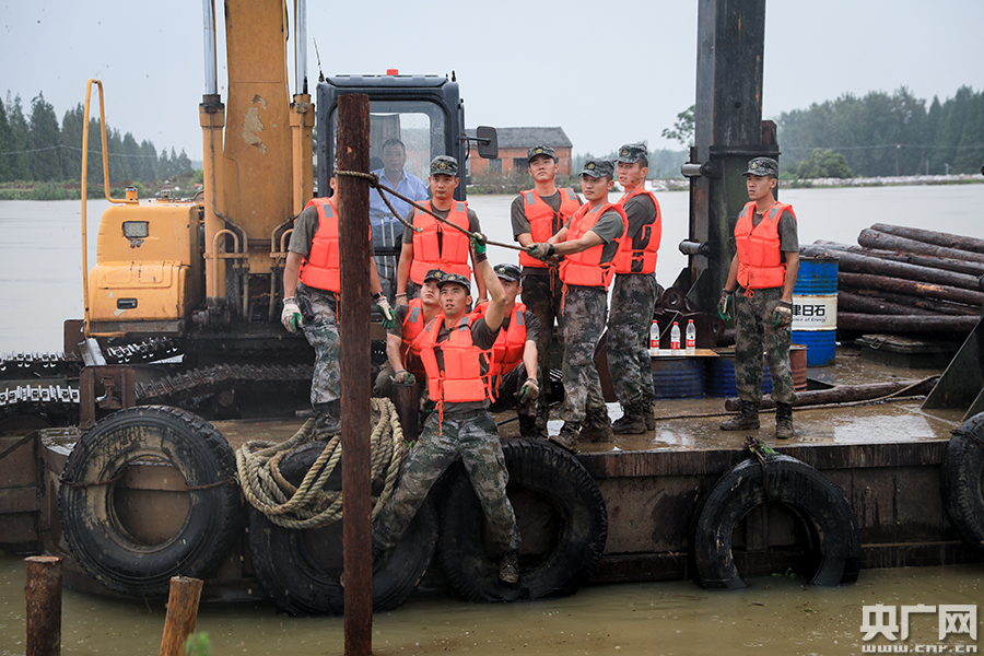 官兵在同大圩筑堤(央廣網(wǎng)記者 石昊鑫 攝)