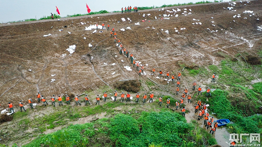 雨一直下,遠遠望去,堤壩上的“迷彩服”依舊忙碌著。