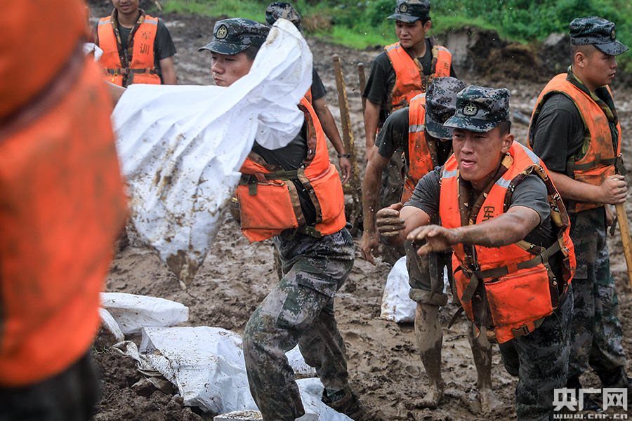7月24日下午,堤壩上一片忙碌。挖掘機搖擺起它的“大臂”,在轟隆聲中把一根根鋼筋搬上堤。不遠處,穿著迷彩服、披著橘黃色救生衣的年輕官兵排成一條“傳送帶”。一雙接著一雙的手將剛裝好的沙石袋傳到堤邊。他們的旁邊,戰(zhàn)友們正俯身鏟土,手中的鐵鍬將一鏟鏟沙土拋上堤壩。他們腳下趟的是水,頭上淋的是雨,身上沾了不少泥。雨越下越大,另一個隊伍立馬奔上堤壩,拉起彩條布蓋住壩體。他們擔(dān)心剛修好的堤壩被雨水侵蝕。