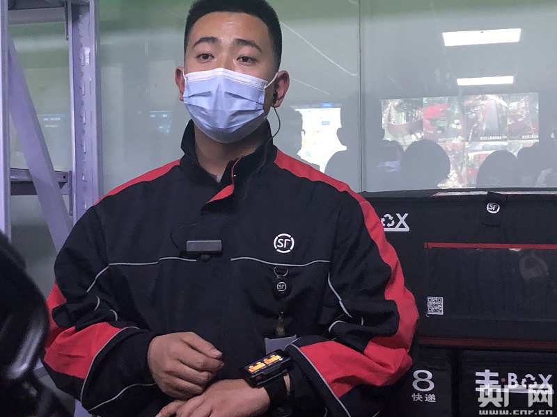 記者還注意到,快遞員的上衣右側(cè)還掛著不大的掃描儀,“用手摁壓掃描儀兩側(cè),一秒內(nèi)就能對(duì)準(zhǔn)商品完成掃描!崩罟庠抡f道。