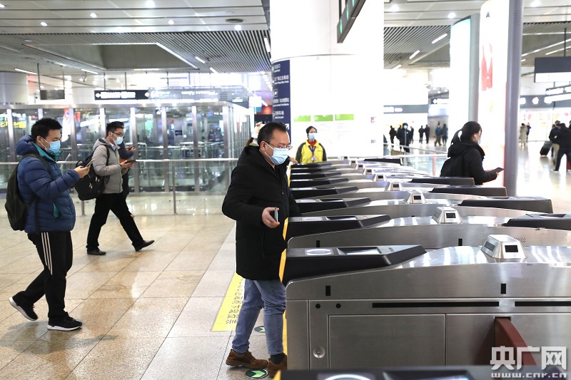 北京南站乘客掃碼出站(央廣網記者 韓靖 攝)