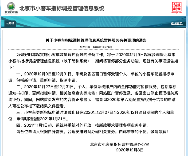 而據北京市小客車指標調控管理信息系統官網的通知顯示,2020年12月27日至12月31日,個人、單位系統賬戶內的全部功能將暫停服務,包括指標通知書打印、更新指標申請、相關信息查詢等功能;網站賬戶暫停登錄,各區(qū)窗口停止受理相關系統業(yè)務。