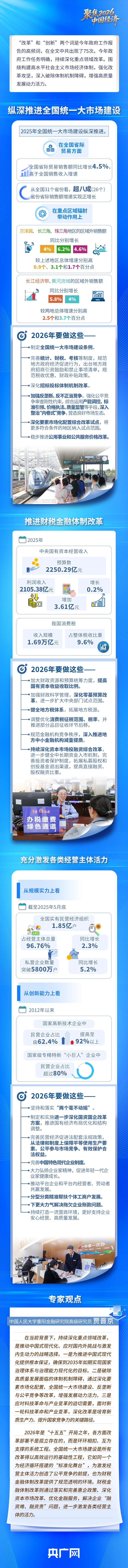 2026年是“十五五”開局之年。政府工作報(bào)告明確將“持續(xù)深化重點(diǎn)領(lǐng)域改革”列為今年政府工作任務(wù),并部署了縱深推進(jìn)全國(guó)統(tǒng)一大市場(chǎng)建設(shè)、推進(jìn)財(cái)稅金融體制改革、充分激發(fā)各類經(jīng)營(yíng)主體活力等一系列具體舉措。“持續(xù)深化重點(diǎn)領(lǐng)域改革”如何為高質(zhì)量發(fā)展破除體制機(jī)制障礙?各方面改革部署如何協(xié)同發(fā)力?央廣網(wǎng)約請(qǐng)相關(guān)專家進(jìn)行解讀。