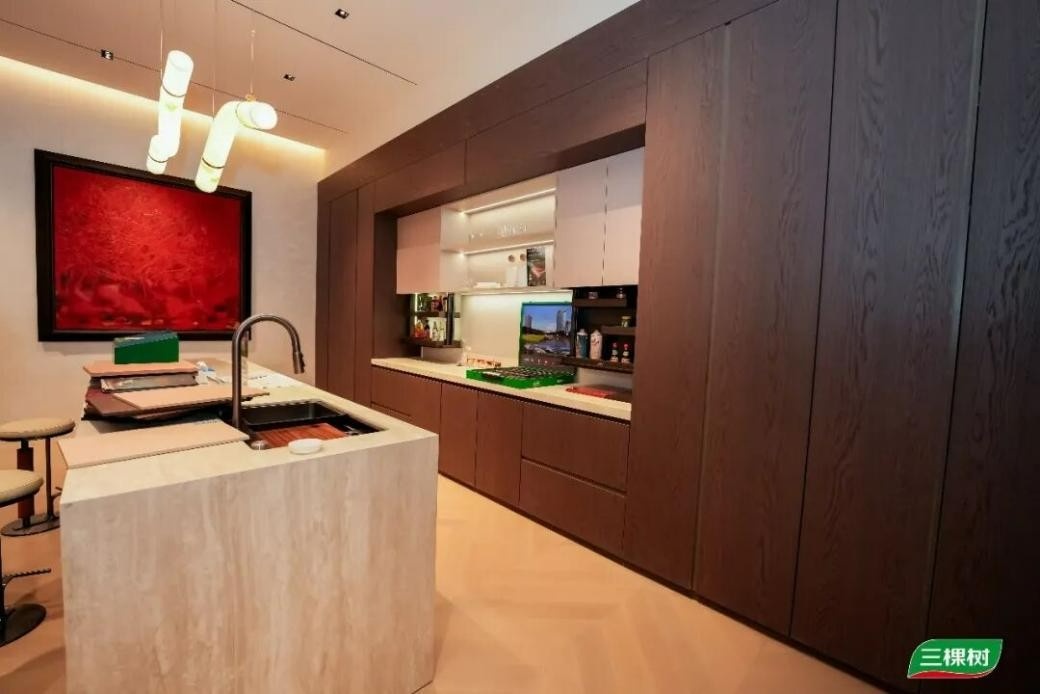 除呈現(xiàn)核心板材及工藝外,三棵樹還推出覆蓋基礎(chǔ)裝修到高端定制的全場(chǎng)景解決方案,將實(shí)木水漆大板、安芯漆面板等產(chǎn)品與客廳、廚房等家居空間深度融合,通過實(shí)景體驗(yàn)為“好房子”提供全鏈路健康板材支撐。