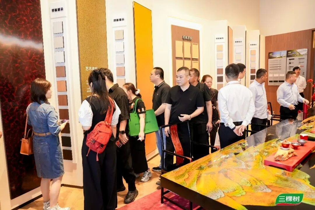 本次展會(huì),三棵樹以小森板與藝術(shù)漆融合為設(shè)計(jì)內(nèi)核,融入多元?jiǎng)?chuàng)新肌理,通過極簡動(dòng)線與場(chǎng)景化敘事,構(gòu)建“自然質(zhì)感與科技美學(xué)共生”的沉浸式體驗(yàn)空間。展館現(xiàn)場(chǎng)人氣高漲,觀展者絡(luò)繹不絕,紛紛駐足沉浸式體驗(yàn)產(chǎn)品魅力,成為展會(huì)中極具人氣的打卡點(diǎn)。
