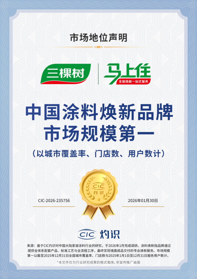 以產(chǎn)業(yè)之力踐行民生擔(dān)當(dāng),以品牌之責(zé)引領(lǐng)行業(yè)前行。“中國(guó)涂料煥新品牌市場(chǎng)規(guī)模第一”不僅是三棵樹(shù)“馬上住”的新起點(diǎn),更標(biāo)志著中國(guó)涂料煥新行業(yè)步入高質(zhì)量發(fā)展的新征程。未來(lái),三棵樹(shù)“馬上住”將持續(xù)深化“1+N”生態(tài)戰(zhàn)略,聚力產(chǎn)品研發(fā)與服務(wù)升級(jí),與全國(guó)經(jīng)銷(xiāo)商伙伴同頻共振,融入國(guó)家“好房子”建設(shè)大局,以更健康、更美麗、更美好的居住環(huán)境,回應(yīng)億萬(wàn)家庭對(duì)美好生活的向往,為產(chǎn)業(yè)轉(zhuǎn)型升級(jí)與民生福祉提升貢獻(xiàn)更多力量。