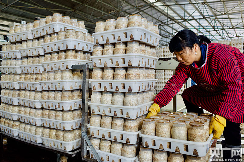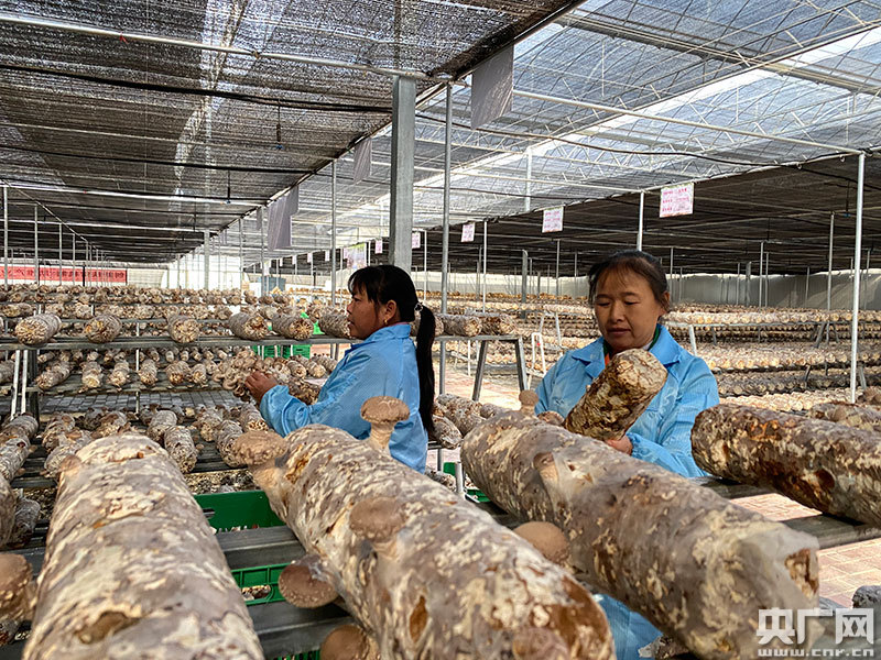 在食用菌菌包生產(chǎn)打包車間忙碌的村民(央廣網(wǎng)記者 王一凡 攝)