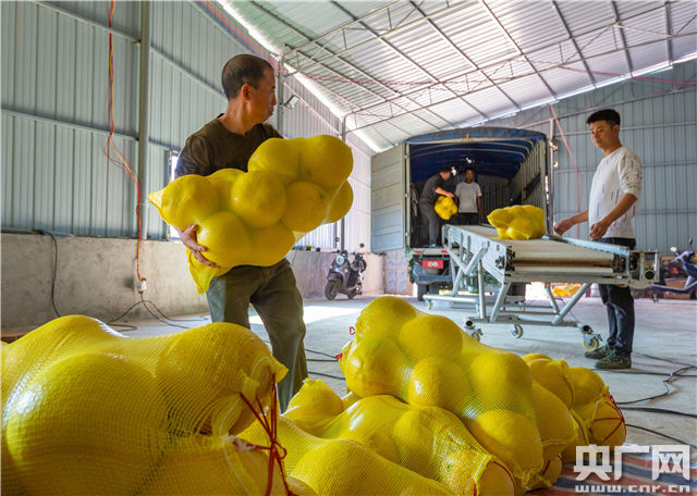 果農(nóng)把剛采摘的柚子搬運(yùn)上車,銷住外省。(通訊員拍攝)