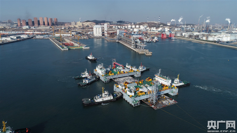 我國北方首條跨海沉管隧道——大連灣海底隧道工程首節(jié)沉管正在浮運對接(央廣網(wǎng)發(fā) 中交一航局供圖)