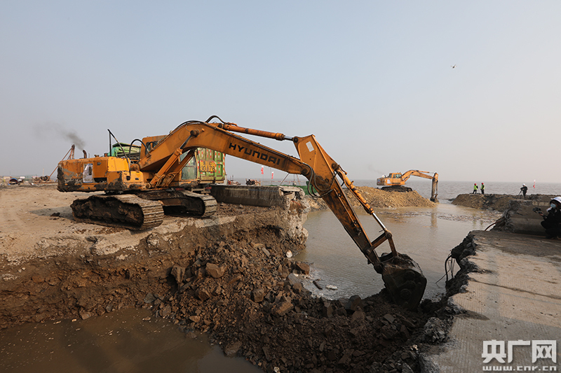 央廣網(wǎng)溫州12月28日消息(記者王海鵬 魏煒 范雨婷 通訊員鄭翀翀 莊海文)12月28日上午9:10,浙江溫州市區(qū)連接洞頭島的靈霓大堤壩頭段施工現(xiàn)場。隨著一聲“開挖”命令的下達(dá),2020溫州藍(lán)色海灣整治行動“破堤通!惫こ陶絾。在挖掘車的作業(yè)下,不一會兒工夫,大堤被鑿開,甌江口南北兩端相互隔絕了14年的海水順勢涌入,重新匯合一處。甌江口海洋生物洄游的生命通道打通了。