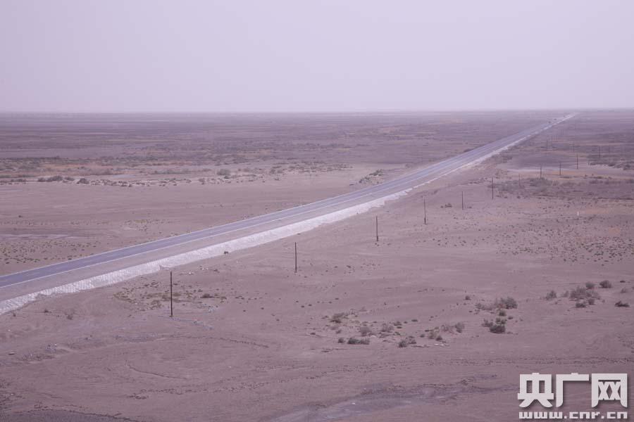 2008年,218國道穿過干涸的臺特瑪湖 -