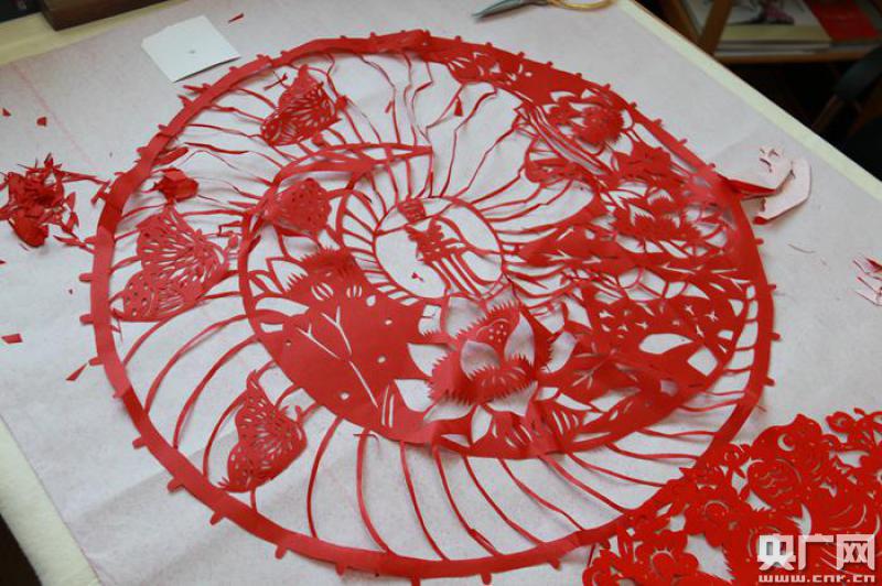 記者最近就來到了一位剪紙藝術家王慶松的工作室,首先看到了一個剛剛由王慶松老師剪好的直徑約有五十厘米的紅紅的大團花,這個大團花有八只狗與牡丹花組成,王慶松告訴記者這幅作品花費了整整三天的時間完成,代表瑞犬迎新春。 -