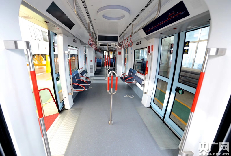 列車屬于100%低地板,無需站臺乘降,一步即可上車,方便老人、兒童和殘障乘客通行。為了營造更舒適的乘坐體驗,車廂內(nèi)裝還采用了一系列新的人性化設(shè)計。列車配置了國際級別的殘障人士輔助設(shè)備,如列車配置助聽系統(tǒng),無障礙車門開關(guān)按鈕以及殘障人士求助按鈕,極大方便殘障人士出行。車內(nèi)扶手采用紅色白色兩種顏色,對比強烈更加具有辨識度。列車配備WIFI系統(tǒng),正式上線運營時與當?shù)剡\營商網(wǎng)絡(luò)對接,乘客可以用電腦和手機隨時接入網(wǎng)絡(luò)系統(tǒng)。