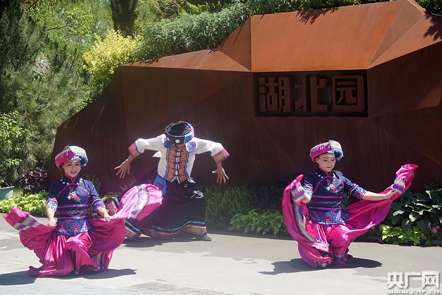 湖北園入口處的迎賓表演豐富多彩(央廣網(wǎng)記者 胡瑩瑩 攝)