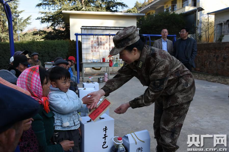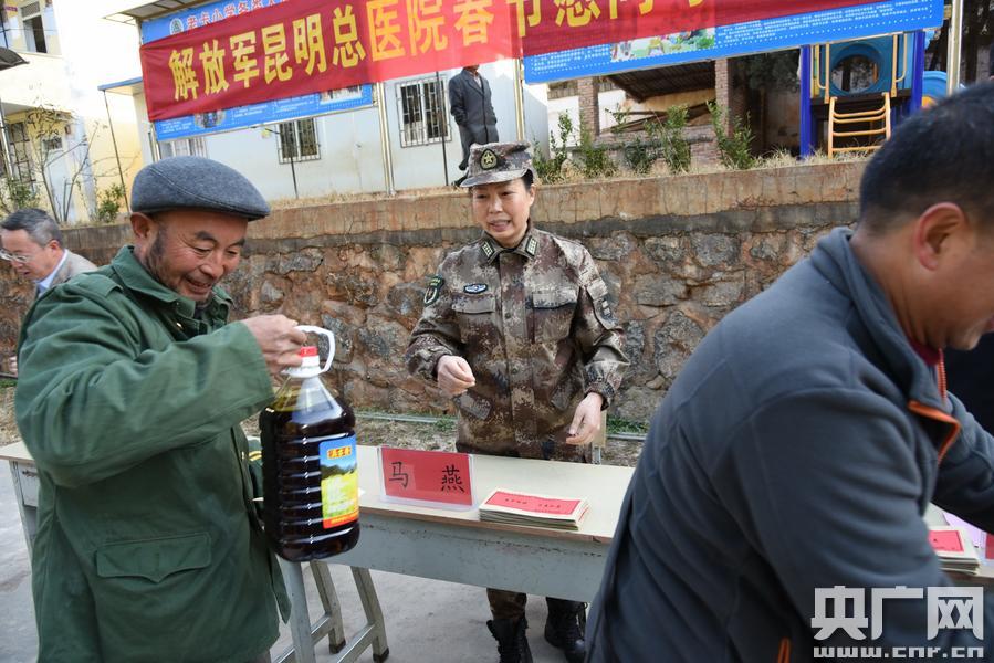 解放軍昆明總醫(yī)院春節(jié)慰問尋甸縣貧困戶及軍烈屬、傷殘軍人(圖片由通訊員提供) 央廣網(wǎng)昆明1月24日消息(記者李騰飛 通訊員阮建波 馬鑫)1月20日至23日,隆冬時節(jié)的金沙江畔依然陽光明媚,昆明市尋甸縣563戶困難群眾和軍烈屬、傷殘軍人領(lǐng)取到了解放軍昆明總醫(yī)院送來的慰問品和慰問金。 1月20日,昆明總醫(yī)院副政委兼政治部主任馬燕帶領(lǐng)該院10余名官兵來到尋甸縣柯渡鎮(zhèn),為413戶貧困戶及兩參人員送去溫暖和祝福,給他們發(fā)放慰問品和慰問金。82年前,中央紅軍和賀龍、肖克率領(lǐng)的紅二、六軍團長征先后兩次路經(jīng)柯渡鎮(zhèn),留下了許多動人的故事,至今在柯渡老百姓中廣為流傳。 “現(xiàn)在黨的政府更好、解放軍官兵更親,不僅幫助我們發(fā)展產(chǎn)業(yè),還關(guān)心我們困難戶的生活”,在柯渡鎮(zhèn)新莊村慰問儀式現(xiàn)場,村支書王國君感慨。他介紹,全村共820戶,貧困戶就有316戶,有97戶兩參人員,解放軍在春節(jié)前來慰問非常溫暖。 “當(dāng)年,柯渡人民為紅軍巧渡金沙江作出了貢獻。多年來,黨和軍隊從沒忘記,一直關(guān)心關(guān)注這里百姓的生活!贬t(yī)院副政委馬燕在慰問儀式上深情地說,此次慰問活動中,醫(yī)院做到最大限度的覆蓋到新莊村的每一個貧困戶。