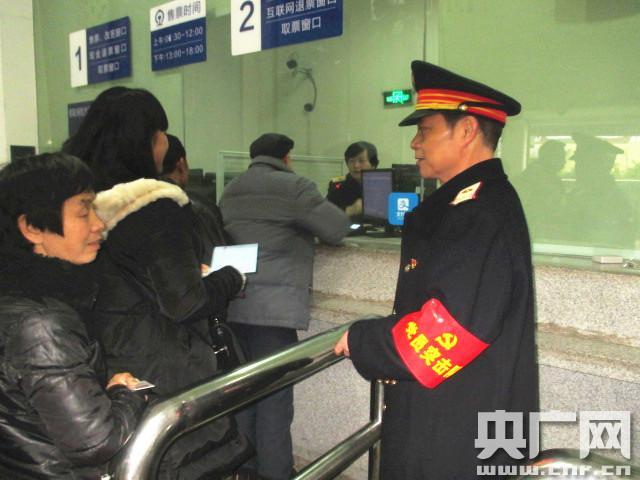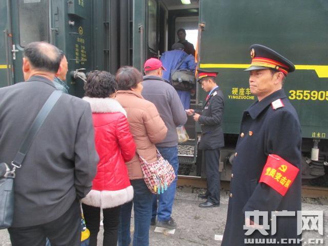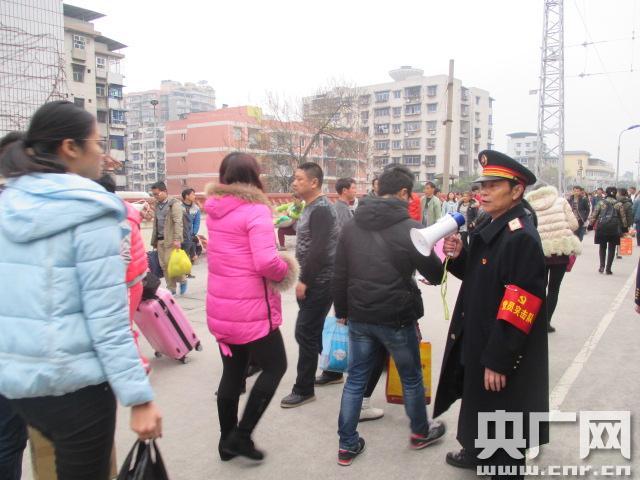 堅(jiān)守38年 “光榮”的最后一個(gè)春運(yùn)(央廣網(wǎng)發(fā) 程禮松攝) “請(qǐng)大家不要擁擠,排好隊(duì)進(jìn)站上車……”2月5日上午,記者見到老唐時(shí),聲音沙啞的他正手持話筒在引導(dǎo)旅客有序排隊(duì)。樸素的制服,胸前黨徽格外顯眼,手持對(duì)講機(jī)隨時(shí)聽著對(duì)講機(jī)那頭傳來的聲音,隨時(shí)微笑回答旅客的咨詢。出生在鐵路世家的“光榮”22歲時(shí)就從父親手中接過“指揮棒”來到鐵路,先后在襄渝線上的祿市、渠縣、華鎣、三匯壩、磨心坡和川黔線上的珞璜等站工作過,從連接員、扳道員、信號(hào)員、值班員、副站長(zhǎng)到黨支部書記,行走在襄渝、川黔線38年,擔(dān)任黨支部書記20余載。 -