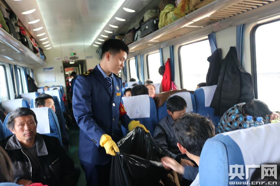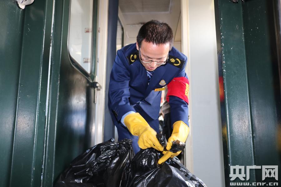 “春運之星”王開羽正在車廂內(nèi)收集垃圾(莫然 攝) -