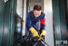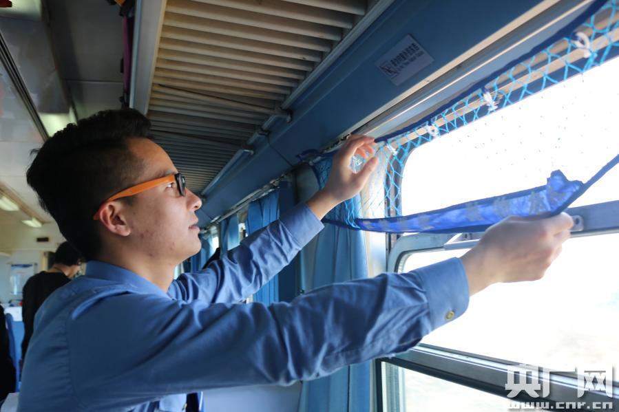 “春運之星”蘇熙正在安裝車窗防護網(wǎng)(莫然 攝) -