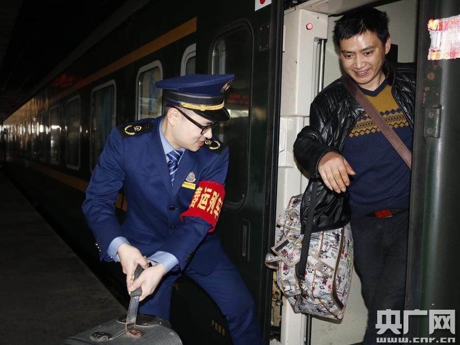 “春運之星”羅剛正在清理車廂里的垃圾(莫然 攝) 央廣網(wǎng)重慶2月17日消息(記者劉湛 通訊員莫然 曲麗娟)為提高春運服務(wù)質(zhì)量,展現(xiàn)成動青年風(fēng)采,成都動車段159名團員青年主動請纓加入到春運臨客值乘隊伍中,并積極參與“春運之星”評選活動。圖為2月15日團員青年正在K4140次列車上熱情服務(wù)旅客。 -