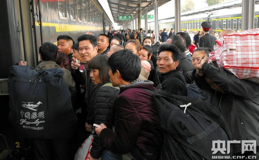 •   2月22日,凱里火車站外出務工旅客在排隊上車中。(央廣網(wǎng)發(fā) 姜澤鵬攝)   央廣網(wǎng)黔東南苗族侗族自治州2月22日消息(記者陳屹 通訊員姜澤鵬)2月22日,春運結(jié)束后第一天,成都鐵路局凱里火車站迎來務工流和學生流高峰。   客流方向主要往上海、北京、廣州、重慶、福建等。春運結(jié)束,服務不減,貴州鐵路嚴把實名制驗證驗票和“三品”檢查關口,對進站口、檢票口、站臺、天橋、地道、電梯、樓梯等重點部位加強盯控,做好客流引導和旅客服務工作。
