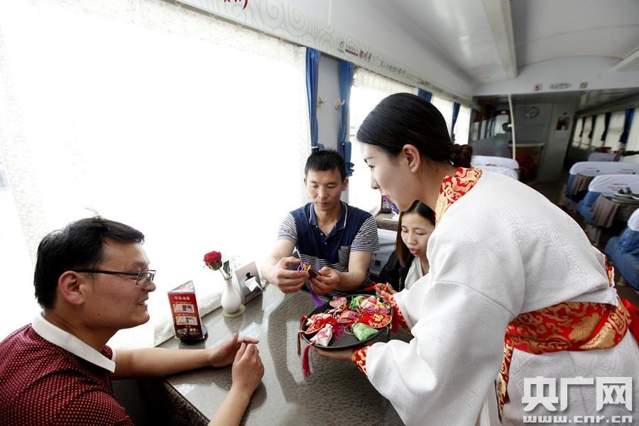 乘車旅客品嘗特色美食,感受魅力端午 央廣網(wǎng)銀川5月27日消息(記者許新霞 通訊員李麗霞 李峰峰)華美優(yōu)雅的漢服,芳香四溢的荷包,五顏六色的細絲花花繩,醇美香甜的驅(qū)蟲雄黃酒……5月26日,銀川開往杭州的K1805次“絲路驛站-銀川號”品牌列車“粽香銀客行、濃濃端午情”主題活動為乘車旅客精心打造了“傳承傳統(tǒng)文化、感受精品服務”的端午之旅。 “包中香黍分邊角,彩絲剪就交絨索。樽俎泛菖蒲,年年五月初!睘榻o乘車旅客營造更加安全、方便、舒適、溫馨的出行氛圍,在該次列車餐車,工作人員拉起了彩綢,張貼好小彩旗,掛上香包、艾草等,將車廂裝扮得處處彌漫著濃郁的節(jié)日氣氛。列車工作人員特別準備了糯米、粽葉、大棗、葡萄、花生等食材,盛情邀請乘車旅客包起了粽子,大家手法嫻熟、巧手翻飛,現(xiàn)場歡聲笑語不斷!邦^一回在列車上過端午,我不單單感受到了較之于南方更加濃烈的節(jié)日氣息,而且在這一系列的環(huán)節(jié)中,也被我們祖國博大精深的傳統(tǒng)文化所感染和感動,我覺得特別有意義!”來銀川出差的杭州人魏先生表示。 列車還將獨具特色的蒸艾葉、甜醅、八寶茶等西北特色小吃搬上列車,工作人員與乘車旅客共品香茗茶、共敘端午情!拔逶挛,雄黃燒酒過端午!鄙碇鴿h服的列車工作人員邀請乘車旅客共飲黃酒,為乘車旅客涂雄黃,驅(qū)蟲遏毒;戴荷包,掛花花繩,互送祝福,讓大家感受到旅行中彌漫的傳統(tǒng)文化的馨香。 隨著小長假探親流、短途客流的激增,該段其他各次列車也陸續(xù)開展了一系列活動,精心打造端午魅力出行新體驗,為乘車旅客送上風格迥異的“一見‘粽’情,寧夏號陪您過端午”列車主題活動、端午民俗茶話會、包粽子比賽、端午習俗問答等端午民俗文化大餐,與乘車旅客一起回味記憶中的端午味道,感受傳統(tǒng)文化的魅力。