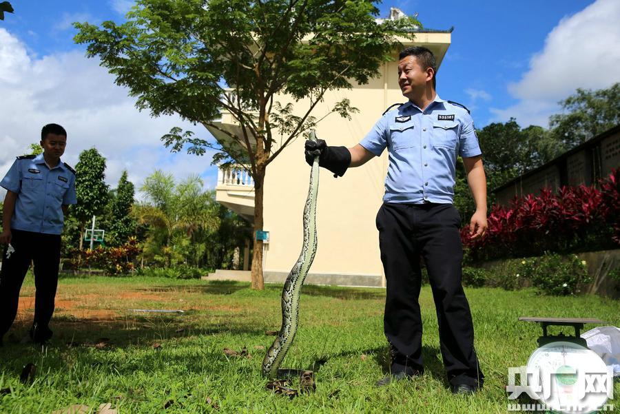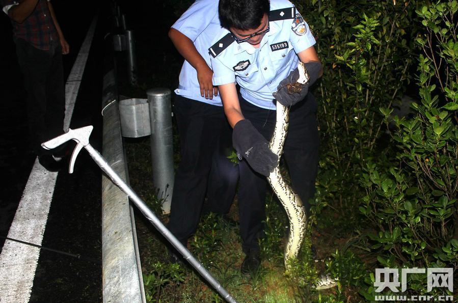 幾經(jīng)周折終將巨蠎控制并捕獲 央廣網(wǎng)西雙版納9月13日消息(記者李騰飛 通訊員常國(guó)軒)11日,一條近3米長(zhǎng)的國(guó)家一級(jí)保護(hù)野生動(dòng)物巨蟒突然橫穿小磨高速公路,這可嚇壞了司機(jī)和乘客。駕駛員沐師傅當(dāng)即向森林公安機(jī)關(guān)報(bào)警,森警及時(shí)為遭遇“驚魂時(shí)刻”的駕乘人員排險(xiǎn)。 當(dāng)晩21時(shí)30分,云南省西雙版納州森林公安局勐侖派出所接到報(bào)警電話稱:在路過(guò)小磨高速公路勐侖服務(wù)區(qū)附近勐侖服務(wù)區(qū)的時(shí)候,有一條大蛇從高速公路中間穿過(guò),可能被碾。 接警后,為了防止大蛇傷人和大蛇自身受到傷害,西雙版納州森林公安局勐侖派出所立即組織民警攜帶捕蛇工具趕往現(xiàn)場(chǎng)。 家住西雙版納州勐臘縣勐捧鎮(zhèn)小紅橋的報(bào)警人沐師傅介紹,當(dāng)天晚上他帶家人及朋友一行5人駕車(chē)景洪市返回勐臘至小磨高速公路勐侖服務(wù)區(qū)3公里時(shí),突然發(fā)現(xiàn)一條3米多長(zhǎng)的大蛇橫穿公路,嚇得他猛踩剎車(chē)猛打方向,驕車(chē)差點(diǎn)撞上了路邊護(hù)欄,驚魂未定的他在家人的建議下?lián)艽蛄穗娫拡?bào)警。 在沐師傅的指引下,出警森警在高速公路中間的綠化帶內(nèi)發(fā)現(xiàn)了大蛇。此時(shí),受到驚嚇大蛇將身子蜷縮成一大團(tuán)藏在樹(shù)叢中,口里不時(shí)還吐出紅色舌頭,沖著四周的圍觀的人群發(fā)出嘶嘶叫聲。經(jīng)過(guò)十幾分鐘的努力,出警民警終12日凌晨1時(shí)05分將大蛇控制并捕獲帶回了森林派出所。 9月12日,經(jīng)民警和野生動(dòng)物保護(hù)站技術(shù)人員現(xiàn)場(chǎng)檢查和鑒定,這是一條國(guó)家一級(jí)保護(hù)野生動(dòng)物緬甸蟒,身長(zhǎng)2.6米、體重7千克,身體無(wú)外傷,體征正常,身體非常健康。下午,經(jīng)過(guò)半天的飼養(yǎng)觀察,在征求專家的意見(jiàn)后,勐侖森林派出所安排專車(chē)專人,聯(lián)系并邀請(qǐng)勐侖自然保護(hù)區(qū)管護(hù)人員一起將巨蟒放生到了附近的西雙國(guó)家級(jí)自然保護(hù)區(qū)勐侖子保護(hù)區(qū)石灰山片。
