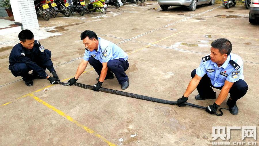 這是一條身長2.6米的眼鏡王蛇 央廣網(wǎng)普洱9月14日消息(記者李騰飛 通訊員李艷 常國軒)近日,在云南省普洱市鎮(zhèn)沅縣恩樂鎮(zhèn)復(fù)興村田心組,一條2.6米長眼鏡王蛇竟然趁著夜色悄悄溜進(jìn)魚塘邊的彭先生家床下,準(zhǔn)備就寢的彭先生被嚇得蹦出房間,不敢再進(jìn)屋睡覺。 9月12日22時(shí)30分,鎮(zhèn)沅縣森林公安局值班民警接到110轉(zhuǎn)來的報(bào)警電話稱:復(fù)興村田心組彭某某家住房的床下在著一條大蛇。接警后,鎮(zhèn)沅縣森林公安立即指派有捕蛇經(jīng)驗(yàn)的民警由政委帶隊(duì)趕往事發(fā)現(xiàn)場。 屋主彭先生驚魂未定地說:“下午4、5點(diǎn)左右,我在魚塘邊喂魚時(shí)就看見了這條大蛇,當(dāng)時(shí)也沒有更多的在意。但是在晚上要睡覺時(shí),聽到突然房間床下傳來一陣輕微的聲音。大約5分鐘后,床下再次傳出同樣的聲音。用手電筒一照射,看到一條數(shù)米長的大蛇盤繞在床下!迸硐壬J(rèn)得這是一條眼鏡王蛇,毒性很強(qiáng),他趕緊蹦出房間并電話報(bào)警。 在彭先生的指認(rèn)下,出警民警在彭先生家的床底發(fā)現(xiàn)了一條疑似眼鏡王蛇。由于毒蛇緊緊的盤踞在床底的最里面的墻角處,因?yàn)槭芊孔永锏目臻g限制,無法正常使用捕蛇工具捕捉,于是民警采用驅(qū)趕的方式將蛇趕出床底,經(jīng)過30多分鐘的努力,森林公安民警成功制服了大蛇并將它帶回了森林公安局。 經(jīng)初步鑒定確認(rèn),這是一條眼鏡王蛇,身長約2.6米,重達(dá)6.6斤,屬劇毒蛇類,是世界上最危險(xiǎn)的蛇類之一,已被列入《瀕危野生動(dòng)植物種國際貿(mào)易公約》附錄II名錄中。 考慮到就地放生有可能對(duì)附近村民帶來安全隱患,9月14日上午,鎮(zhèn)沅縣森林公安局安排專車專人把眼鏡王蛇送到了普洱太陽河國家森林公園野生動(dòng)物臨時(shí)收容救護(hù)點(diǎn)臨時(shí)救助站進(jìn)行收容救助。