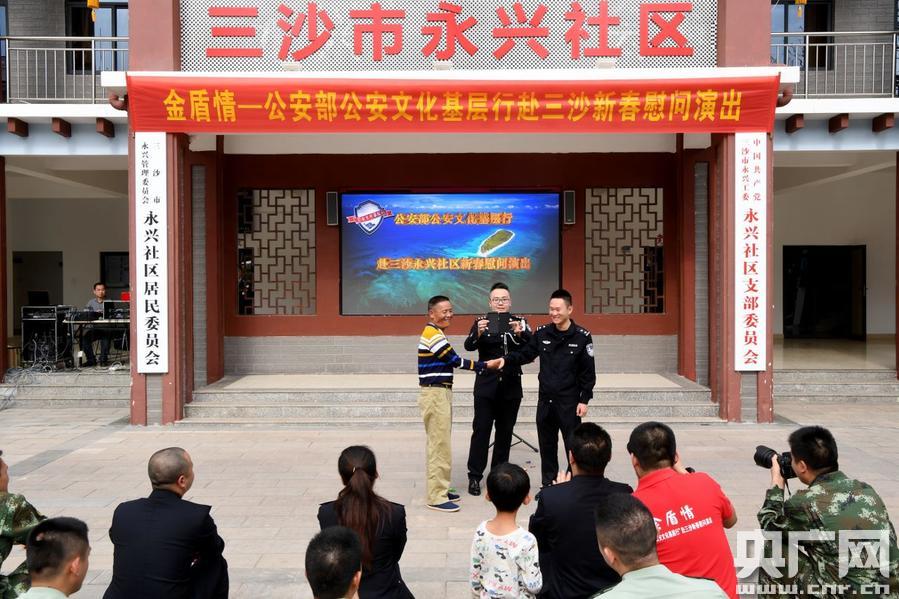 公安部公安文化基層行文藝小分隊走進海南省三沙市慰問演出 2月7日、8日下午,文藝小分隊還分別來到了三沙市永興社區(qū)、三沙公安邊防支隊,為民警、公安現(xiàn)役部隊官兵和社區(qū)群眾獻上了兩場精彩的文藝節(jié)目。文藝小分隊領(lǐng)隊、公安部宣傳局副局長孫潔還分別給三沙市公安局、三沙公安邊防支隊贈送公安文化產(chǎn)品,送上了來自公安部黨委新春的親切慰問和誠摯祝福。 -