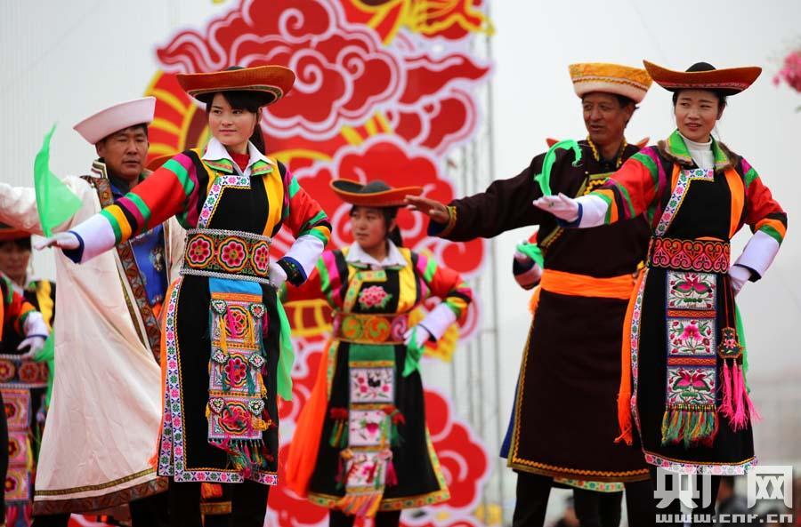 身穿五彩服飾表演土族“安召”舞(央廣網(wǎng)記者 張雷 攝) -