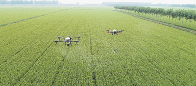 兩臺植保無人機在山東省臨沂市郯城縣馬頭鎮(zhèn)大豐收家庭農(nóng)場進行水稻病蟲害飛防作業(yè)。