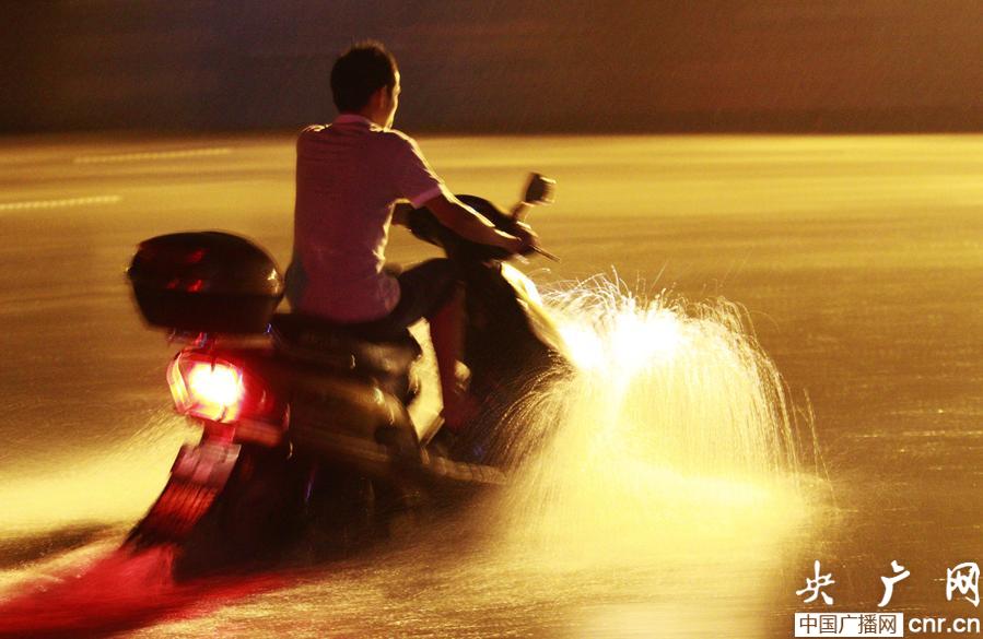 9月24日晚,市民在柳城縣大埔鎮(zhèn)街頭涉水騎行(央廣網(wǎng)發(fā) 鄧克軼 攝)