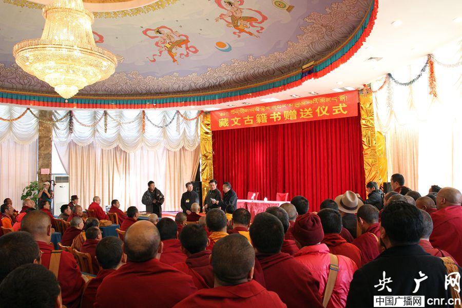 西藏出版協(xié)會(huì)今日向區(qū)內(nèi)三百多家寺廟贈(zèng)送藏文古籍書(央廣網(wǎng)記者 普布次仁 攝)