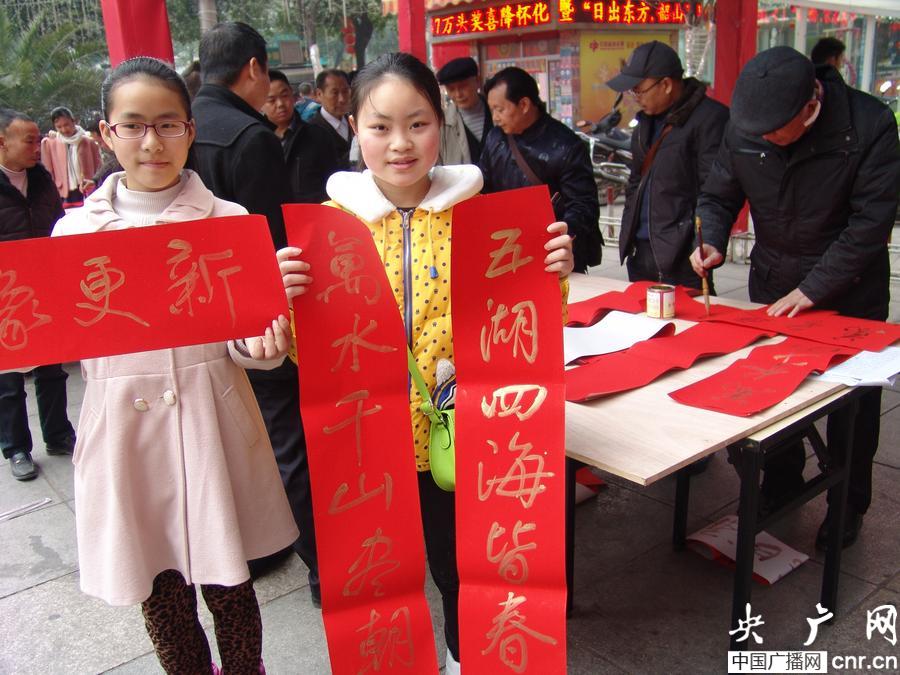 湖南懷化農(nóng)民工及子女高興地拿到了書法家免費(fèi)書寫的春聯(lián)