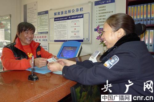 圖為柳州戶籍民警張愛(ài)群把辦好的臨時(shí)身份證遞給市民蘭燕云(圖片由柳州市公安局 秦付林 解小群提供)