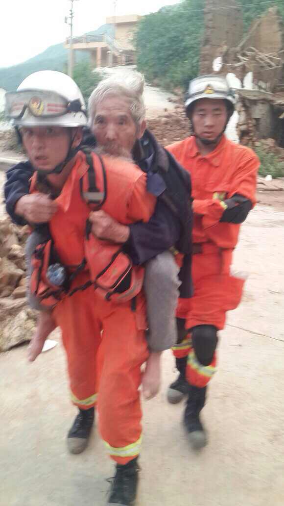 12時(shí)20分,突擊隊(duì)冒著高溫酷暑,在連續(xù)陡坡的鄉(xiāng)間小道上急行軍30分鐘,到達(dá)彎子頭村,并迅速勘察現(xiàn)場(chǎng),了解被困群眾基本情況得知,今年33歲的劉思平因患精神病,經(jīng)常無(wú)端傷害家人和其他群眾,在純屬無(wú)奈的情況下,一年前被家人用鐵鏈講手腳鎖住關(guān)在家中,8月3日地震造成家中房屋部分坍塌,好在劉思平的房間只有后墻向外倒塌,劉思平也因地震徹底被困家中,由于不斷的余震,他隨時(shí)都有生命危險(xiǎn)。救援隊(duì)和村干部商量以后,村干部先穩(wěn)住他的情緒,消防隊(duì)員首先撬開(kāi)已經(jīng)變形的房門(mén),從倒塌的后墻將鐵鎖和鐵絲撬開(kāi),然后再村干部的配合下,消防隊(duì)員冒著隨時(shí)可能倒塌的危險(xiǎn),先清除埋壓鐵鎖的木頭和泥土,其他隊(duì)員、村干部和他聊天,經(jīng)過(guò)10分鐘緊張救援,消防隊(duì)員打開(kāi)了鐵鎖和鐵絲,消防隊(duì)員和村干部將其“騙出”屋內(nèi),順利將其轉(zhuǎn)移到安全地方。