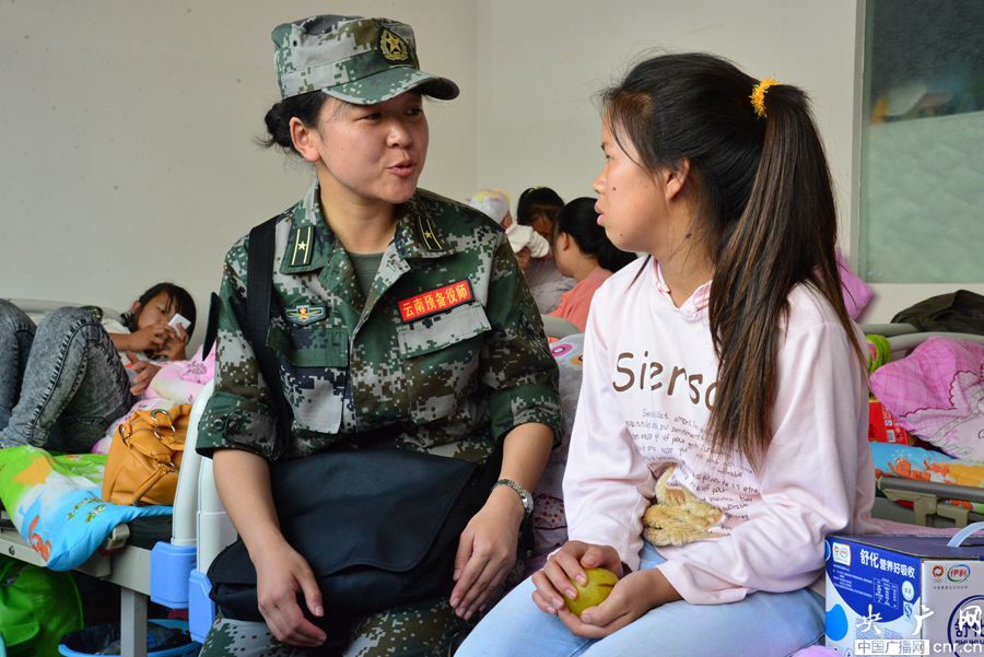 央廣網(wǎng)昭通8月11日消息(記者李健飛 通訊員李進 陳新濤)云南省昭通市魯?shù)榭h人民醫(yī)院、中醫(yī)院、恒博醫(yī)院、維芳醫(yī)院等幾家醫(yī)院是此次魯?shù)椤?.03”地震受傷群眾的集中收治點。醫(yī)院里到處躺滿了傷員,呻吟聲此起彼伏,氣氛壓抑而凝重。身穿白大褂的醫(yī)護人員往來匆匆,十分忙碌。而其中幾位與其他醫(yī)護有些不同,他們耐心地傾聽受傷群眾的親身經(jīng)歷和失去親人的悲痛感受,撫慰受傷群眾傷痛的心。他們就是云南某預(yù)備役師心理服務(wù)分隊的隊員,猶如心靈衛(wèi)士,用溫暖的行動、滿滿的愛,幫助災(zāi)區(qū)群眾消除心理陰霾,重建心靈家園。