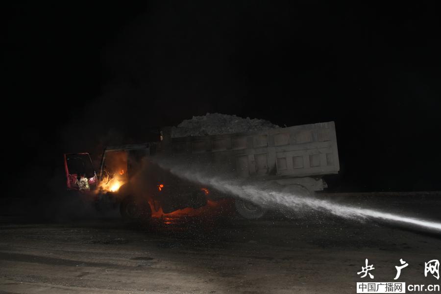 2時25分,黔江消防官兵抵達(dá)現(xiàn)場后發(fā)現(xiàn),一輛重型貨車停在工地道路上,駕駛室內(nèi)正冒著滾滾濃煙,空氣中彌漫著刺鼻的焦味,赤紅的火焰正燃燒著輪胎,時而發(fā)出噼啪聲響,濃濃的黑煙從汽車底部向外冒出,駕駛室火勢正在擴(kuò)大。一旦火勢蔓延到油箱后果將不堪設(shè)想,針對現(xiàn)場情況,消防官兵立即出一支水槍直擊著火點(diǎn),在泡沫水槍的攻勢下,10分鐘后貨車的火勢很快得到控制,為防止復(fù)燃,消防官兵對貨車冒煙部位進(jìn)行噴水冷卻。