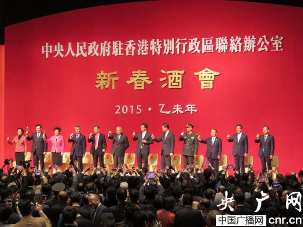 央廣網(wǎng)香港2月4日消息(記者班闖)中央人民政府駐香港特別行政區(qū)聯(lián)絡(luò)辦公室今晚(4日)于香港國際會議展覽中心舉行2015年新春酒會,全國政協(xié)副主席董建華、香港特別行政區(qū)行政長官梁振英、中央政府駐香港聯(lián)絡(luò)辦公室主任張曉明、外交部駐港特派員公署特派員宋哲、駐港部隊政委岳世鑫及來自中央駐港機構(gòu)、香港特區(qū)政府、駐港中資企業(yè)、外國駐港使領(lǐng)館和香港社會各界的4000余名嘉賓歡聚一堂,共慶新春佳節(jié)。