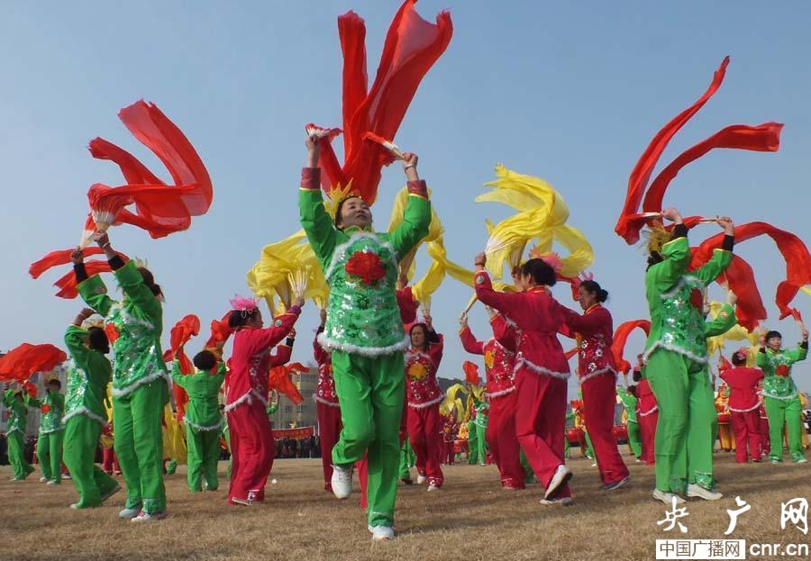 震天的鑼鼓敲起來(lái),歡快的秧歌扭起來(lái)。在奇臺(tái)縣體育場(chǎng),來(lái)自全縣15個(gè)鄉(xiāng)鎮(zhèn)社火團(tuán)們身著節(jié)日的盛裝,帶著飽滿的熱情,為群眾帶來(lái)精彩的表演。在鏗鏘的鼓點(diǎn)聲中,奇臺(tái)鎮(zhèn)秧歌隊(duì)鑼鼓喧天,彩練飛舞。碧流河鄉(xiāng)社火隊(duì)巨龍飛躍,醒獅翻騰,向觀眾頻頻致意,表達(dá)美好祝愿。